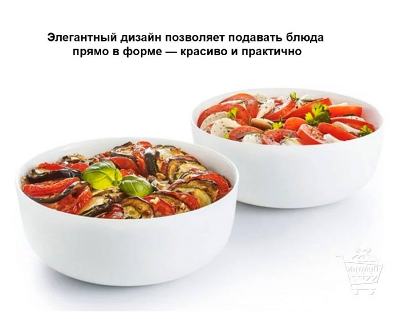 - Универсальность: подходит для духовки, микроволновки и сервировки на столе.