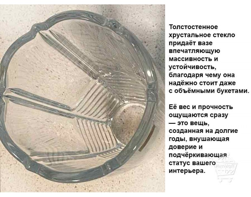 Пусть эта хрустальная ваза станет источником света и красоты в вашем доме. Позвольте ей подчеркнуть изящество каждого цветка и наполнить пространство гармонией. А вы наслаждайтесь тем, как маленькая деталь способна преобразить весь интерьер.