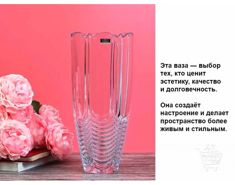 Изделие станет прекрасным подарком для близкого человека, который ценит красоту и утончённые детали в интерьере. Подарив такую вазу, вы дарите не просто предмет, а эмоцию, атмосферу и ощущение уюта. Интерес в этом товаре — в сочетании чешского хрусталя, универсальной формы и безупречной прозрачности, которые делают вазу одновременно функциональной и декоративной. Она станет тем самым элементом, который завершает интерьер и делает его по настоящему гармоничным.