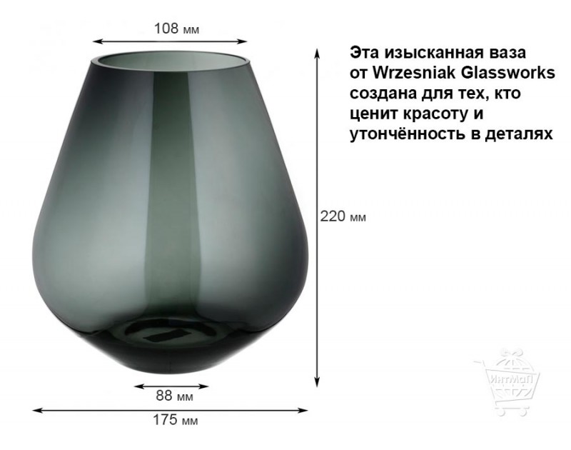 Эта изысканная ваза от Wrzesniak Glassworks создана для тех, кто ценит красоту и утончённость в деталях. Высота изделия составляет 22 см, что делает её универсальной для различных цветочных композиций. Ширина вазы — 17,5 см, а диаметр отверстия в верхней части — 10,8 см, что позволяет легко размещать как пышные букеты, так и одиночные цветы. Диаметр дна — 8,8 см, обеспечивающий устойчивость и надёжность при использовании. Толщина стекла — 4 мм, благодаря чему ваза выглядит массивной и прочной, а также сохраняет свою форму и блеск на протяжении долгих лет. Вес изделия — 1,4 кг, что подчёркивает его солидность и устойчивость. Цвет — дымчато зелёный, меняющий густоту оттенка в зависимости от освещения, создаёт эффект живой игры света и тени. Эта особенность делает вазу уникальной: она словно оживает в интерьере, подстраиваясь под атмосферу помещения.