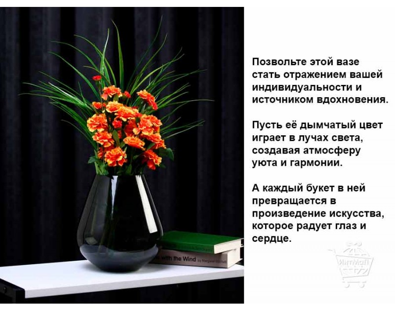 Позвольте этой вазе стать отражением вашей индивидуальности и источником вдохновения. Пусть её дымчатый цвет играет в лучах света, создавая атмосферу уюта и гармонии. А каждый букет в ней превращается в произведение искусства, которое радует глаз и сердце.